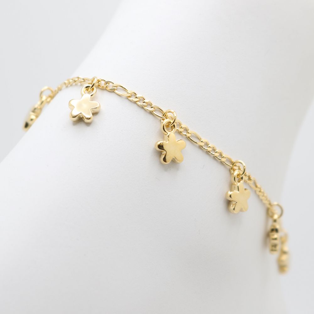 Product Description ANKLET FIGARO WITH FLOWER CHARM G51 18K Gold Filled Thickness: 2 MM Size: 11 INCH Charm size: 8 MM